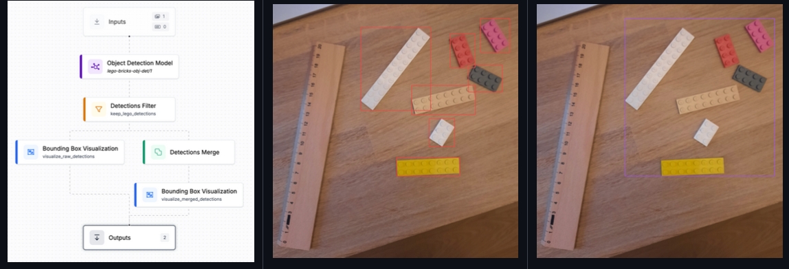 The DetectionsMerge block combines multiple detections into a single bounding box that encompasses all input detections. This is useful when you want to: