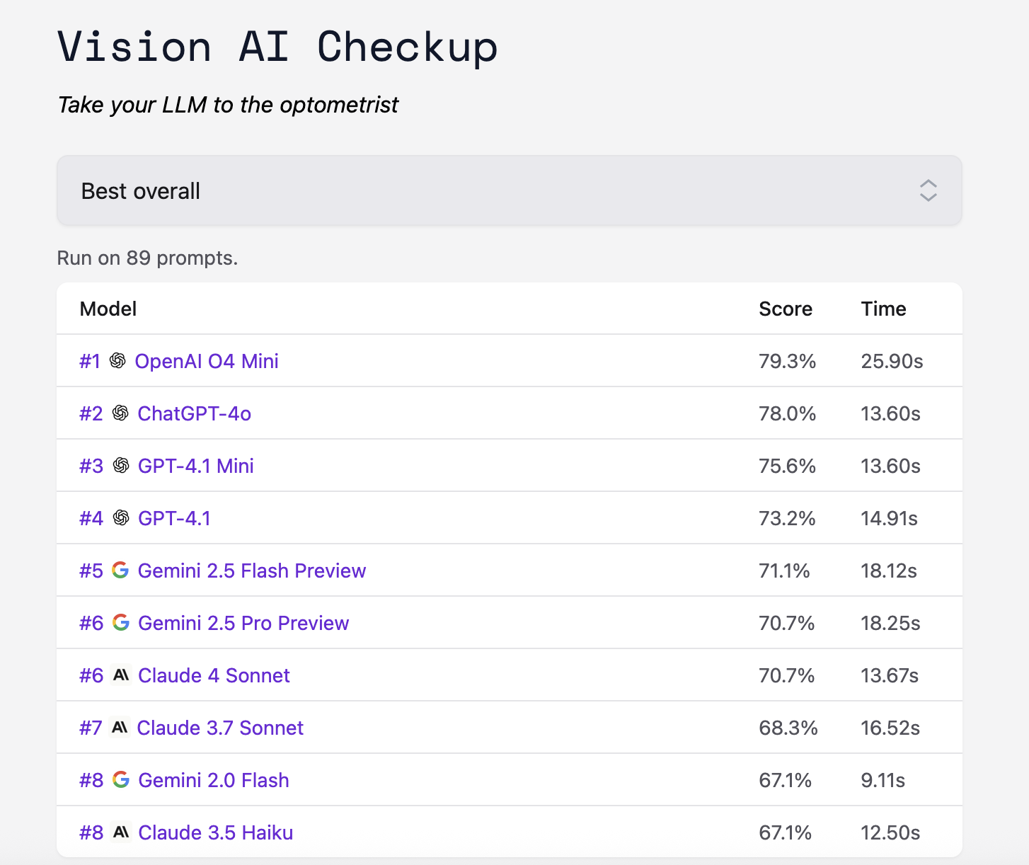 Vision AI Checkup is a website that lets you see how state-of-the-art multimodal models do on a range of real-world tasks. The tool lets you view how models like OpenAI's O4 Mini, and Google's Gemini 2.5 Pro models do on a range of tasks.