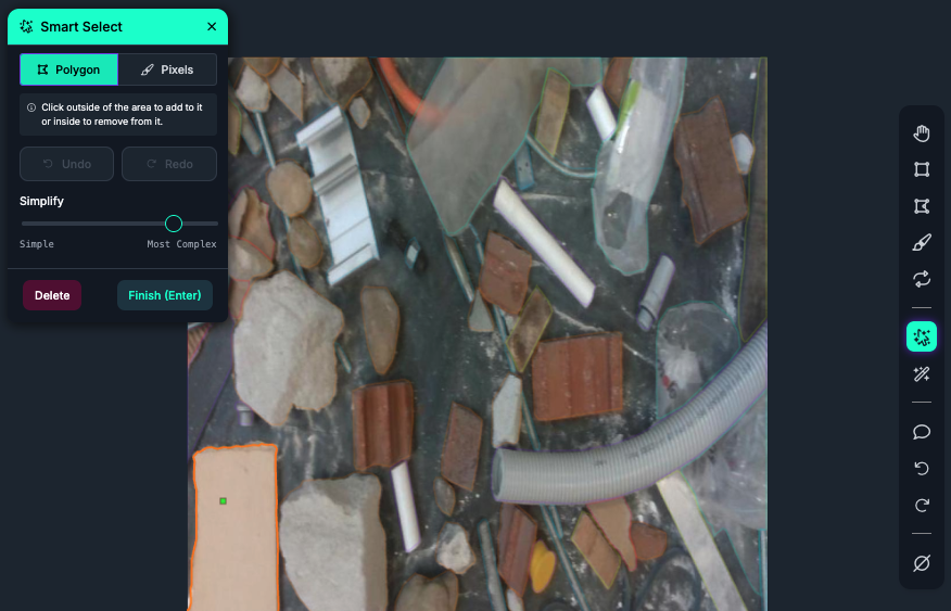 You can now use SAM 3 in Smart Select (Smart Polygon) to identify objects based on points in an image. To use this feature, click on the cursor icon in the left side of the Roboflow Annotate interface. This will enable a tool that lets you click anywhere on an image and calculate a segmentation mask that corresponds with the object you have clicked. This feature is powered by SAM 3.