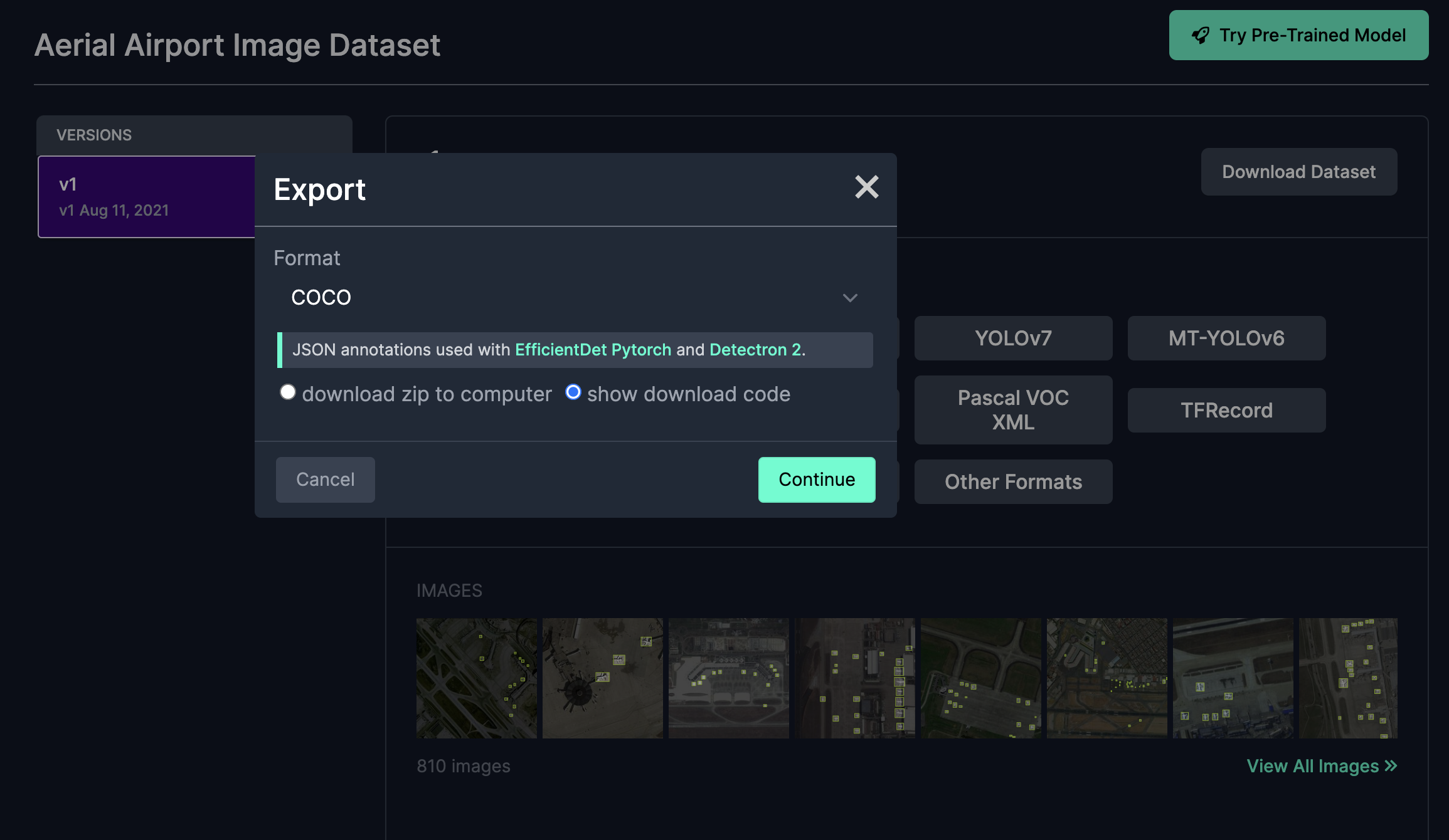 सबसे पहले, Roboflow Universe पर एक डेटासेट ढूँढें। फिर, पर क्लिक करें Download Dataset बटन। एक पॉप अप प्रकट होगा जो आपसे पूछेगा कि आप अपने डेटा को किस फॉर्मेट में एक्सपोर्ट करना चाहते हैं। दिखाए गए विकल्प उन फॉर्मैट्स के अनुकूल हैं जो मॉडल द्वारा हल किए जाने वाले कंप्यूटर विज़न टास्क (object detection, classification, segmentation) के अनुकूल हैं।