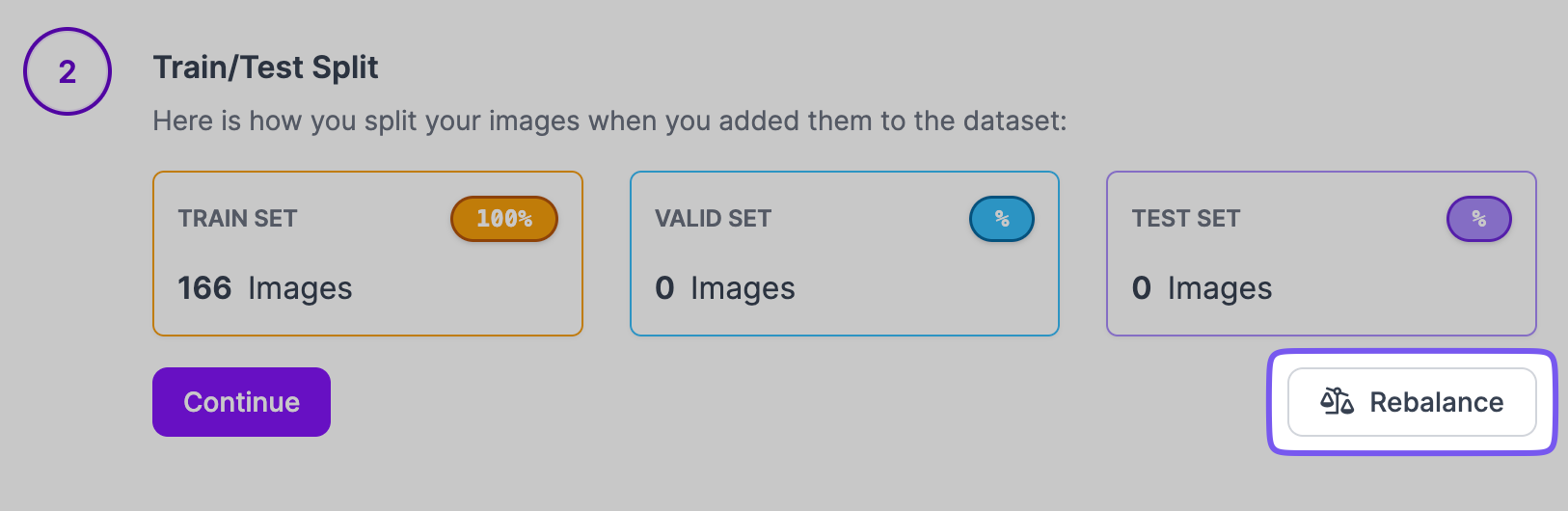 वर्शन निर्माण प्रक्रिया के दौरान, आप अपने training, validation और test सेट के विभाजन का संतुलन भी फिर से समायोजित कर सकते हैं। ऐसा करने के लिए, "Step 2: Train/Test Split" पर जाएँ और "Rebalance" बटन पर क्लिक करें।