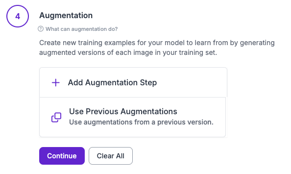 ऑगमेंटेशन जोड़ने के लिए, [एक नया dataset version बनाएँ](https://docs.roboflow.com/roboflow/roboflow-hi/datasets/dataset-versions/create-a-dataset-version).