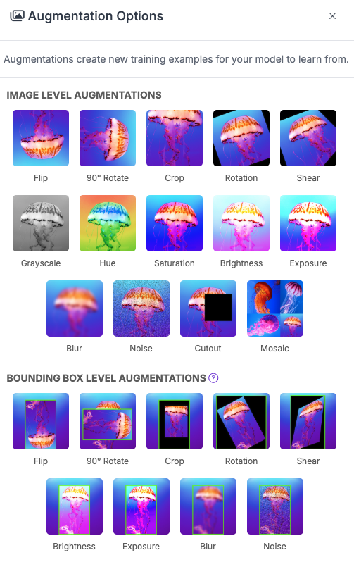 संभव ऑगमेंटेशन विकल्पों की सूची में से चुनें और Apply पर क्लिक करें। एक बार में एकाधिक ऑगमेंटेशन dataset version में जोड़े जा सकते हैं।
