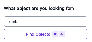 किसी ऑब्जेक्ट को ढूँढने के लिए, "What object are you looking for?" इनपुट फ़ील्ड में उस प्रकार के ऑब्जेक्ट के अनुरूप एक लेबल टाइप करें जिसे आप पहचानना चाहते हैं। उदाहरण के लिए, यदि आप एक ट्रक ढूँढ रहे हैं, तो आप प्रॉम्प्ट "truck" टाइप कर सकते हैं।