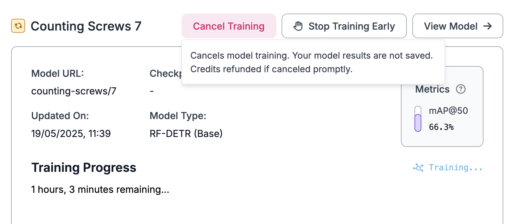 मॉडल प्रशिक्षण जॉब को कभी भी "Cancel Training" बटन का उपयोग करके रद्द किया जा सकता है।