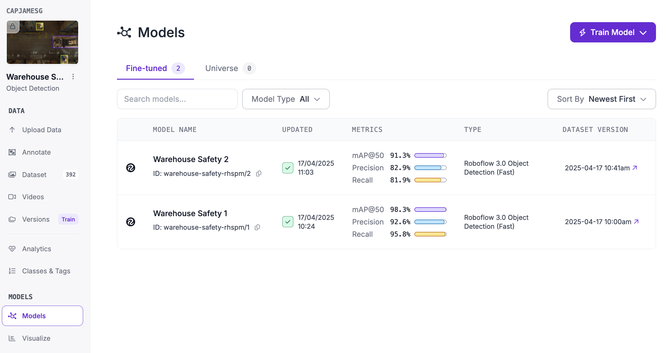 अपने project में सभी Instant और Roboflow Train models देखें।