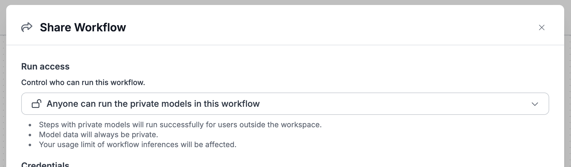 यह तब उपयोगी है जब आप एक ऐसा Workflow साझा करना चाहते हैं जिसमें एक private Model शामिल हो - क्योंकि डिफ़ॉल्ट व्यवहार आपके API key के अंतर्गत नहीं चलना है, private Model वाला Workflow निष्पादित करने में विफल होगा - इसलिए आप इसे protected run की अनुमति देने के लिए बदलते हैं: यह आपके उपयोग सीमाओं को प्रभावित करेगा, लेकिन आपका API Key और मॉडल डेटा हमेशा निजी रहेगा।