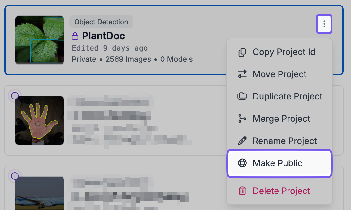 Projectsページで「Make Public」オプションを選択することで、Roboflow上のプロジェクトを公開できます。