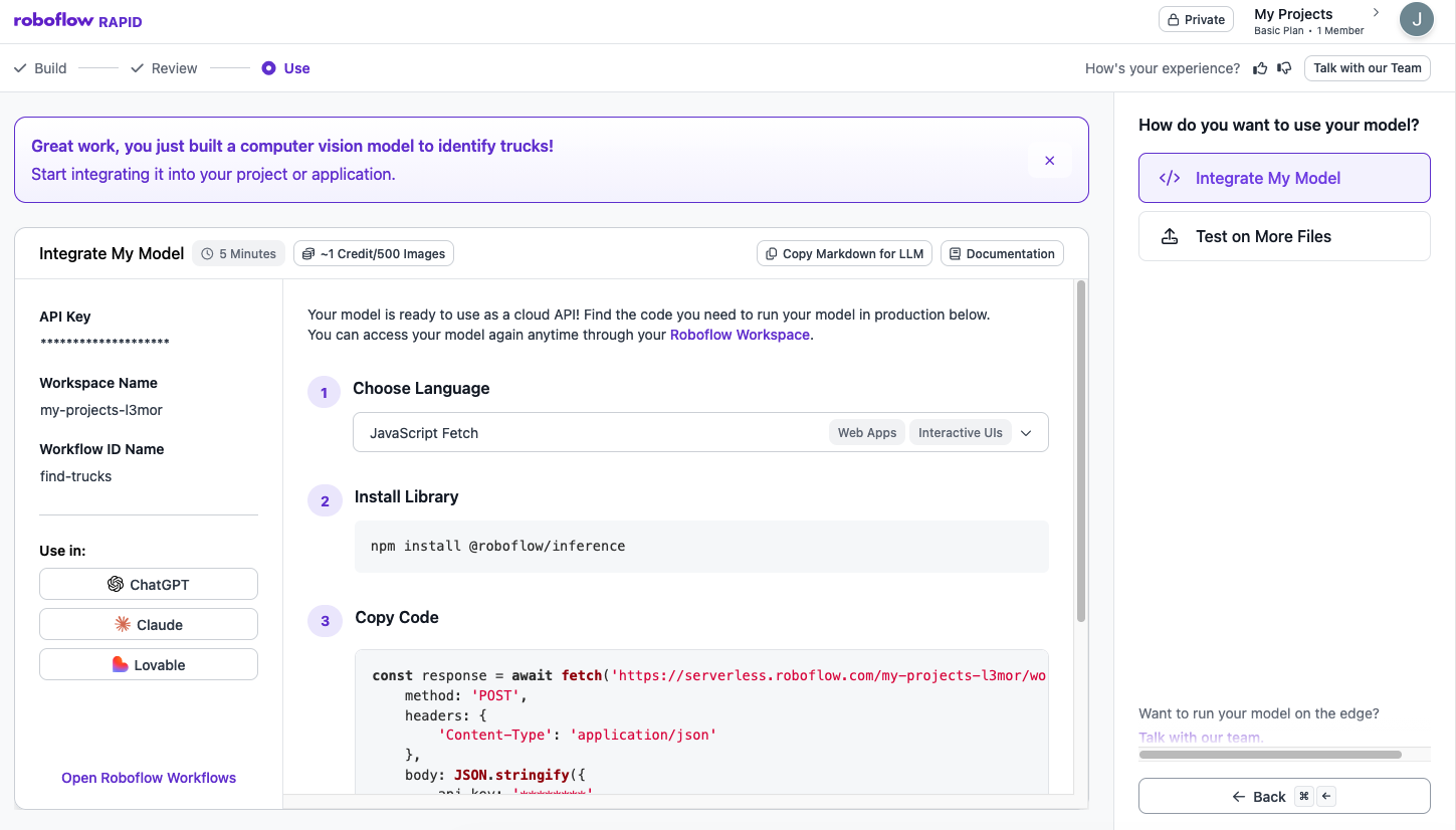 Rapidは、モデルをアプリケーションに統合するために使用できるさまざまなプログラミング言語のコードスニペットを表示します：