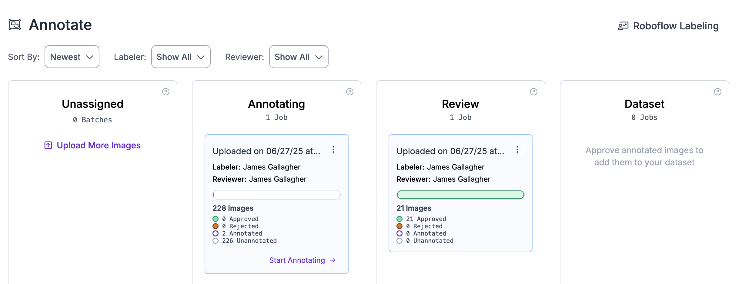 라벨링 작업 보드에서 개별 작업을 클릭하면 해당 작업과 진행 상황에 대한 더 자세한 보기를 확인할 수 있습니다. 여전히 라벨링이 필요한 이미지를 빠르게 확인하고 필요에 따라 작업을 다른 팀원에게 재할당할 수 있습니다. 개별적으로 라벨링된 이미지를 승인하거나 거부하고 필요 시 재작업을 위해 라벨러에게 되돌려보낼 수 있습니다. 그렇게 하려면 이미지 배치를 클릭한 다음 Approved, Rejected, To Do 탭을 전환하여 작업 내 이미지 상태를 확인하세요.