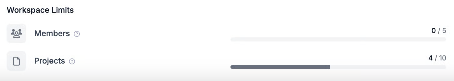 페이지 하단에서 다음 항목에 대해 Workspace Limits에 얼마나 가까운지 확인할 수 있습니다: