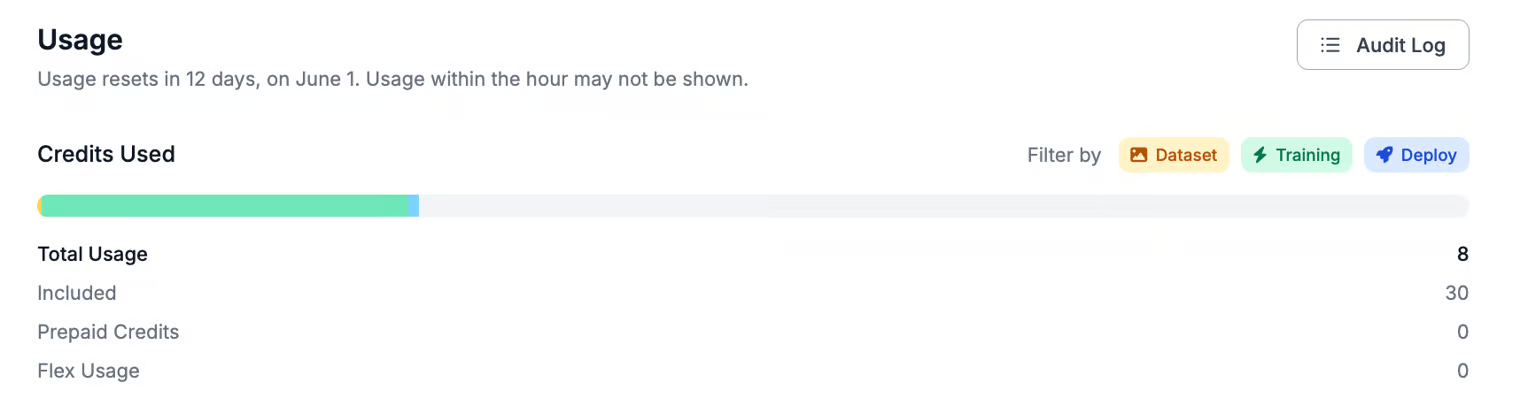 현재 청구 주기에서 사용한 크레딧의 내역을 볼 수 있으며, 기능별로 요약되고 Dataset, Train, Deploy 전반에 걸쳐 나뉘어 표시됩니다.