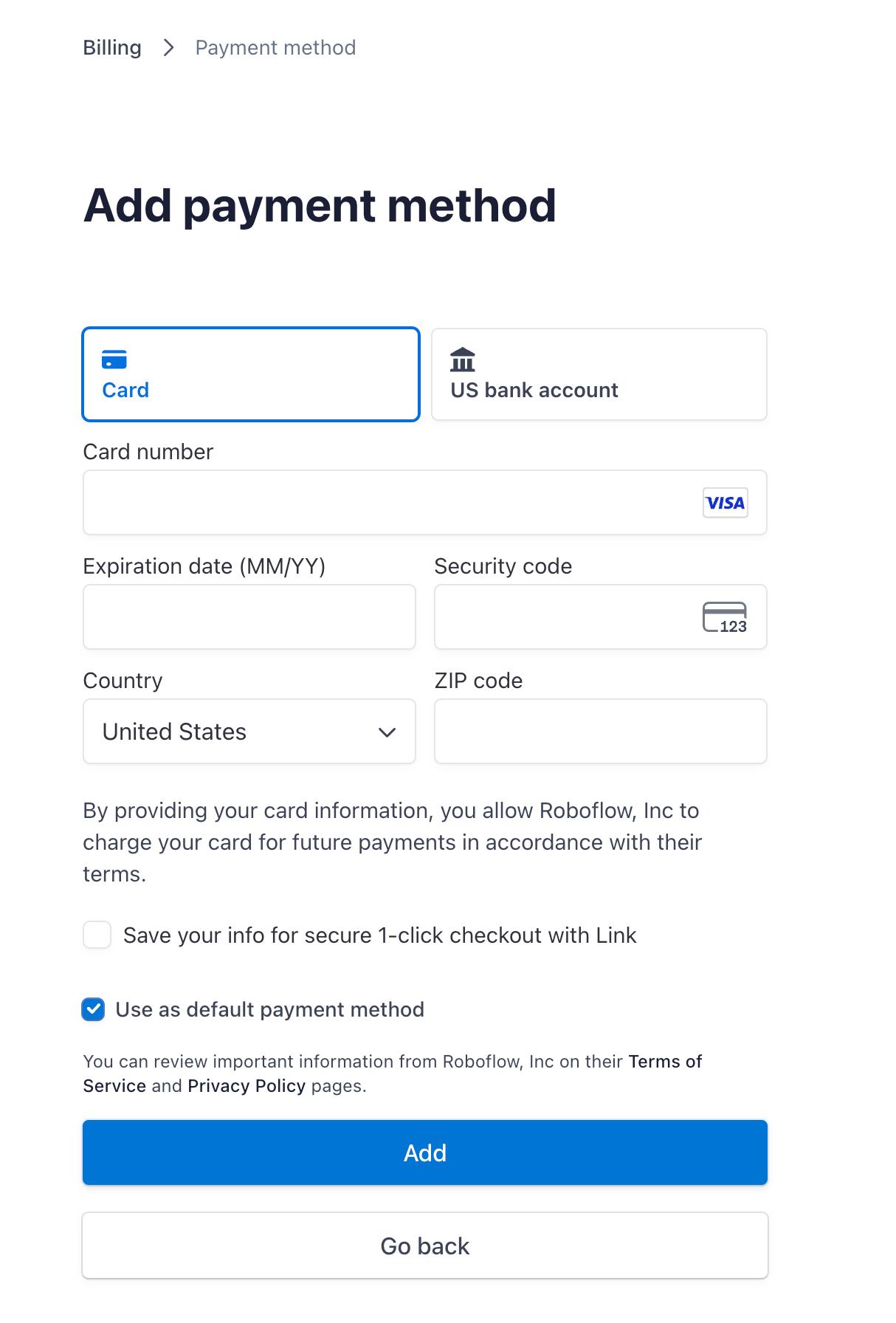 3. 결제 수단의 모든 정보를 입력한 다음 "Add"를 클릭하세요. 이 결제 수단을 기본 결제 수단으로 사용하려면, 이 체크박스도 선택하세요.