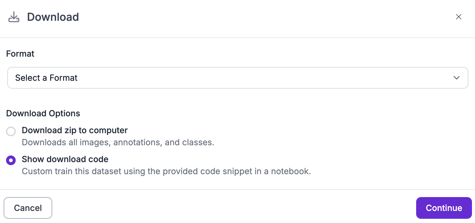 데이터를 다운로드할 형식 옵션을 제공하는 모달이 표시됩니다. Roboflow는 [50개 이상의 다양한 주석 형식을 지원합니다](https://roboflow.com/formats).