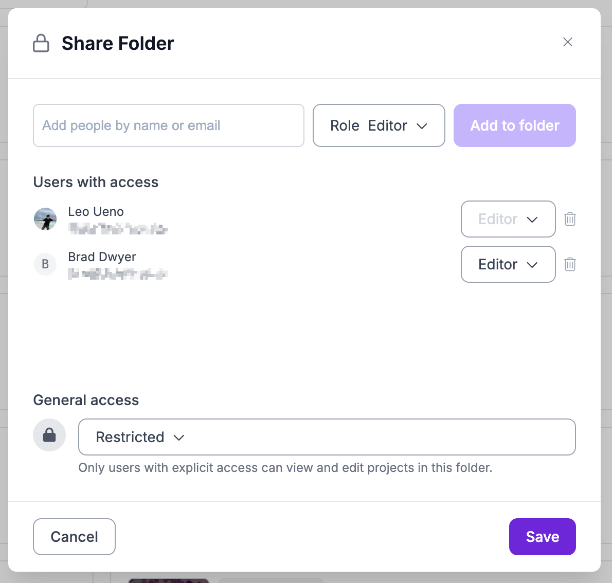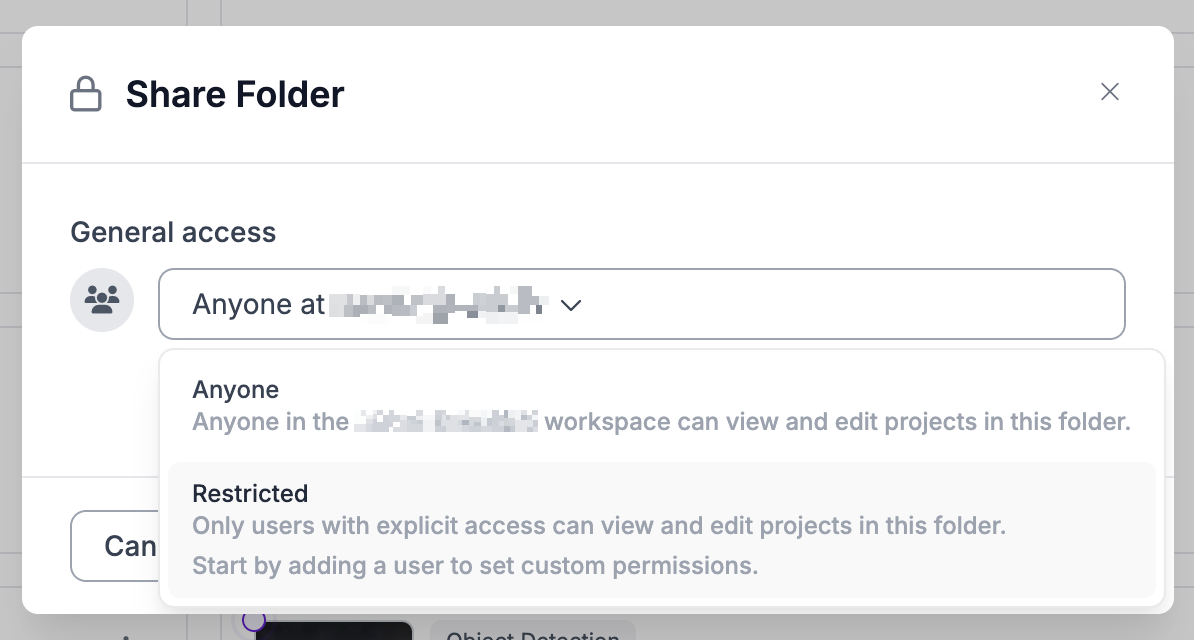 * **Anyone:** workspace의 모든 사용자가 해당 folder와 그 안에 있는 projects에 접근할 수 있습니다. *이는 모든 project folders의 기본 상태입니다*