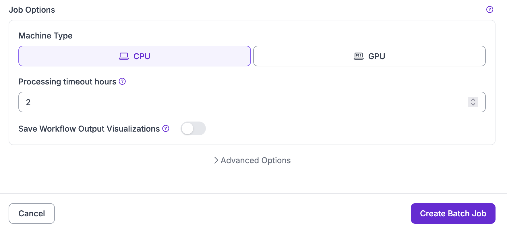 Batch Processing 작업은 CPU 또는 GPU에서 실행할 수 있습니다. GPU 작업은 더 빠르지만 더 비쌉니다.