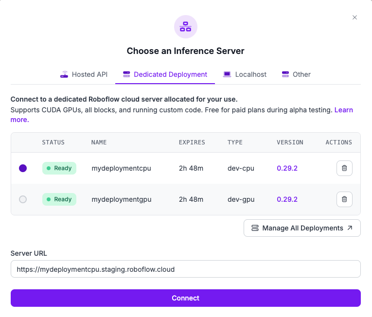 전용 배포는 다음을 실행하기 위한 백엔드 서버로도 사용할 수 있습니다 [Roboflow Workflows](https://roboflow.com/workflows/build). Roboflow Workflows는 컴퓨터 비전 애플리케이션을 만들기 위한 로우코드, 웹 기반 애플리케이션 빌더입니다.