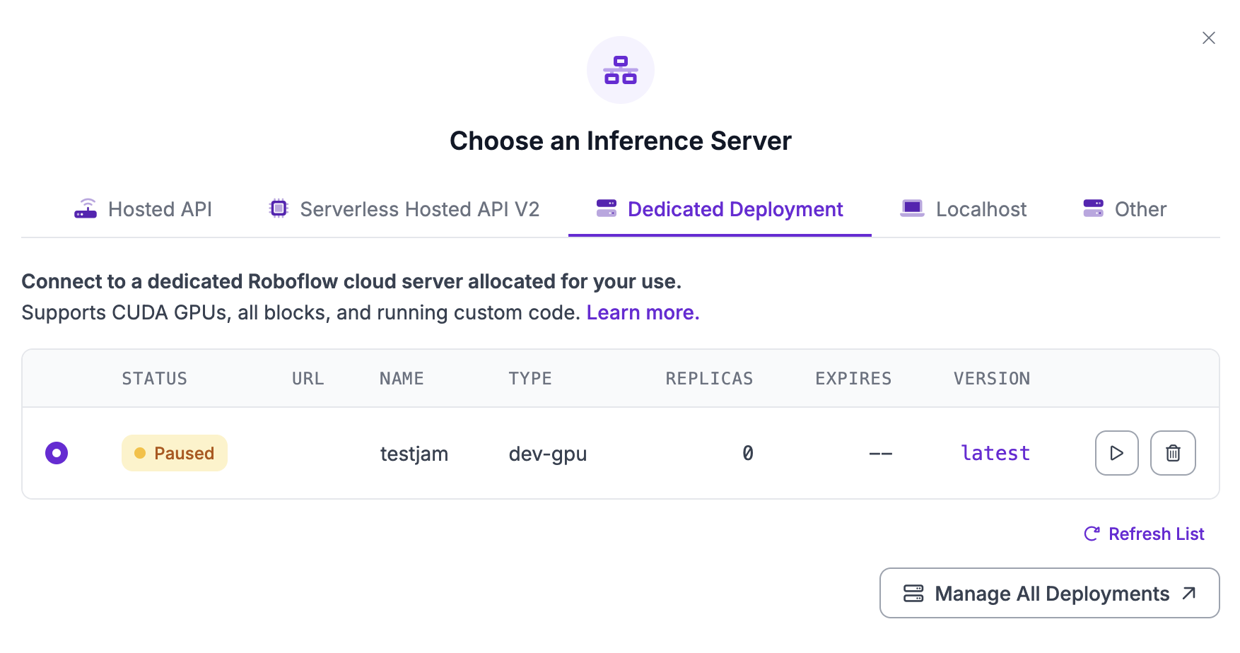 Dedicated Deployment를 다시 시작하려면 다시 시작하려는 Deployment 옆의 재생 아이콘을 클릭하세요.