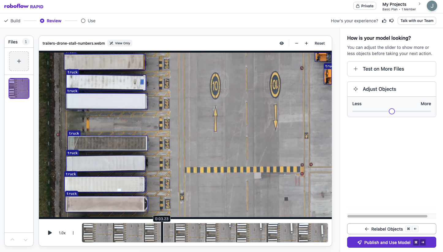 비디오를 업로드한 경우 Rapid는 Rapid 인터페이스에서 보고 있는 비디오의 모든 프레임에 대해 실행됩니다. 그런 다음 비디오를 재생하여 모델의 성능을 확인할 수 있습니다.