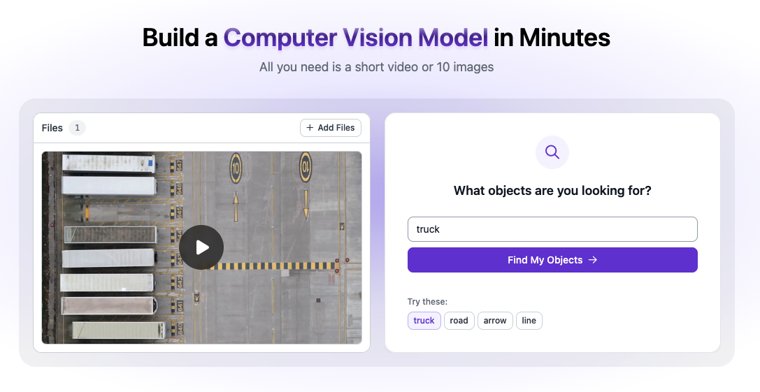 데이터를 업로드하면 찾고자 하는 객체를 묻는 창이 나타납니다. 여기에서 식별하려는 객체의 라벨을 입력하세요. 예를 들어 이미지에서 트럭을 찾으려면 "truck"이라고 입력합니다. Rapid는 페이지의 "Try these" 섹션에서 업로드한 데이터와 관련된 몇 가지 클래스도 제안합니다.