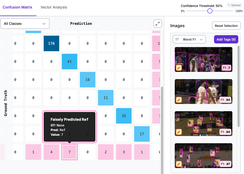 Confidence Threshold 슬라이더를 사용하여 신뢰 임계값을 조정할 수 있습니다. 슬라이더를 구성하면 혼동 행렬, precision 및 recall이 업데이트됩니다: