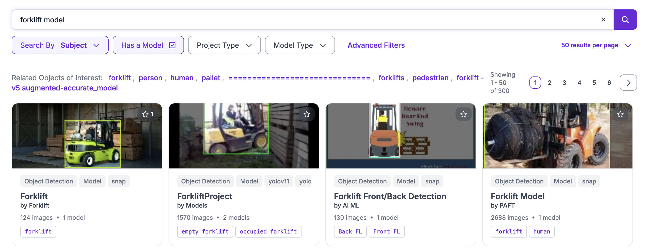 Universe에서 데이터셋을 찾으려면 검색 창에 식별하려는 항목을 입력하세요. 검색 페이지에서 "Has a Model" 상자를 선택합니다: