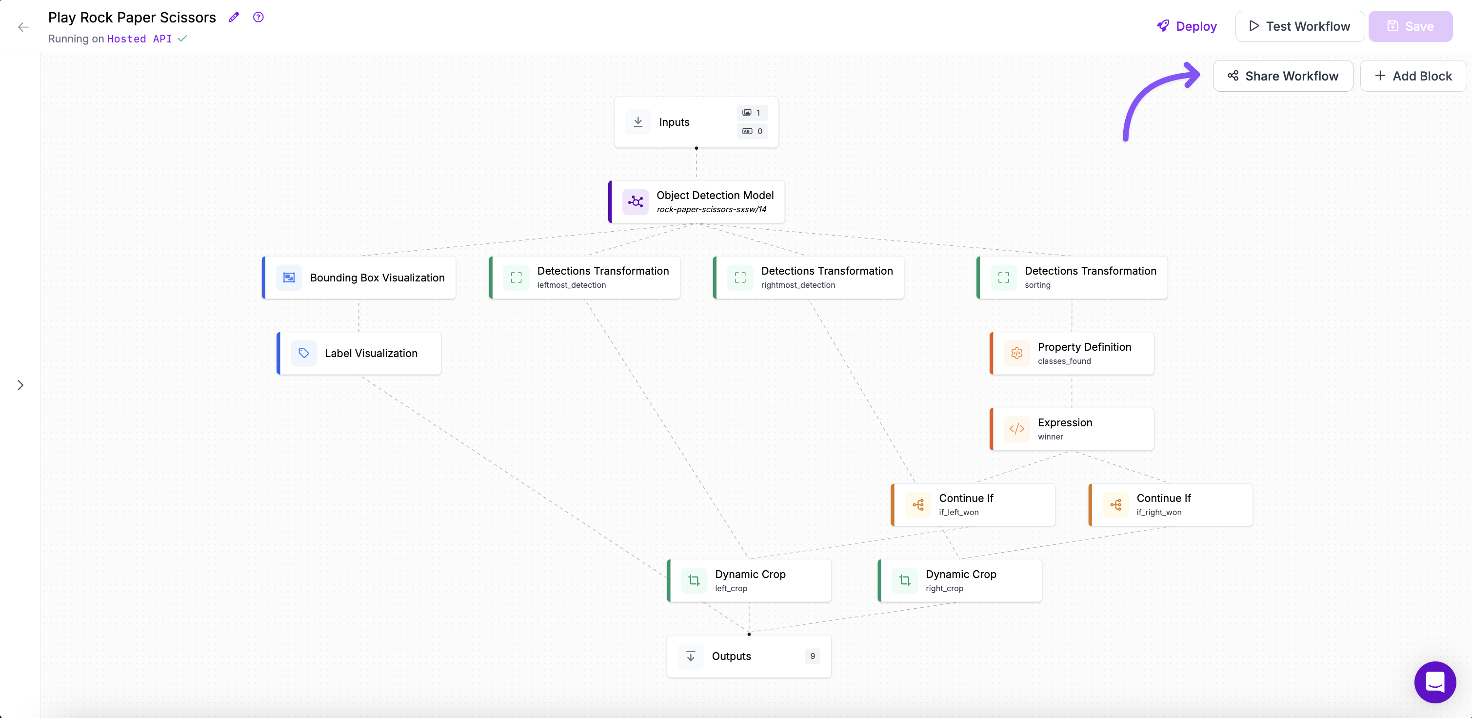 다음은 사진을 입력으로 받아 가위바위보 게임의 승자를 결정하는 공유 가능한 워크플로 예시입니다. 한번 시도해보세요!